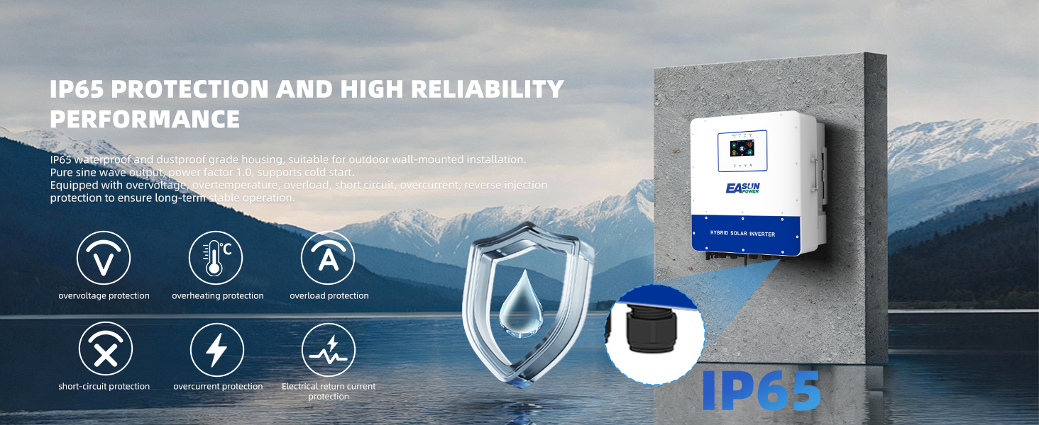 The inverter features an IP65-rated waterproof and dustproof enclosure, suitable for outdoor wall-mounted installation.