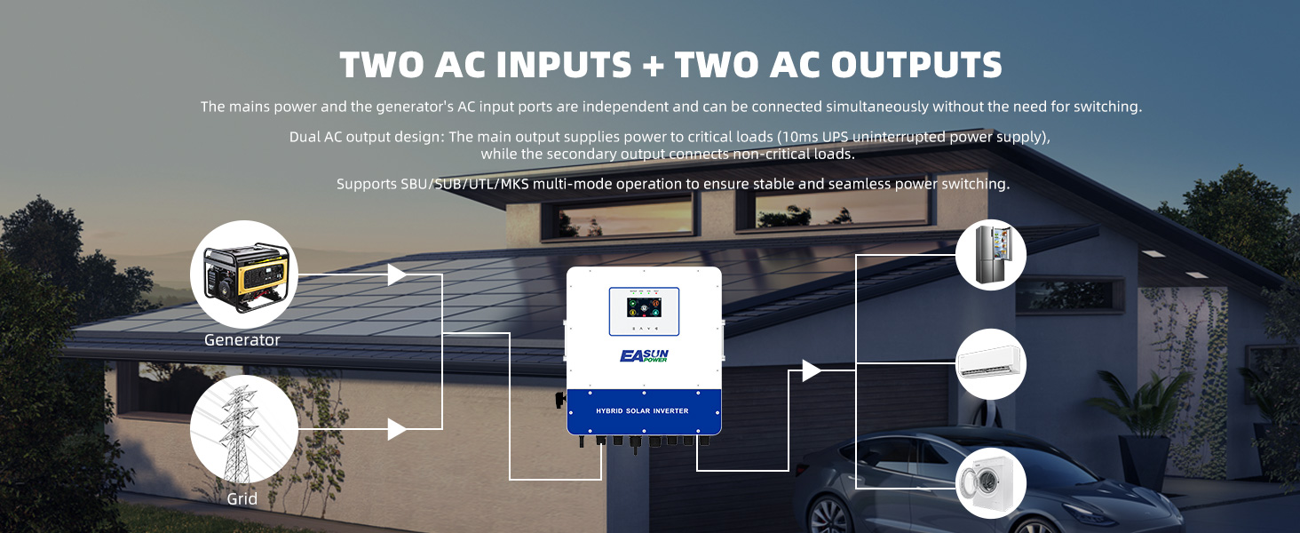 The inverter supports independent AC input ports for the grid and generator, allowing both sources to be connected simultaneously without manual switching.
