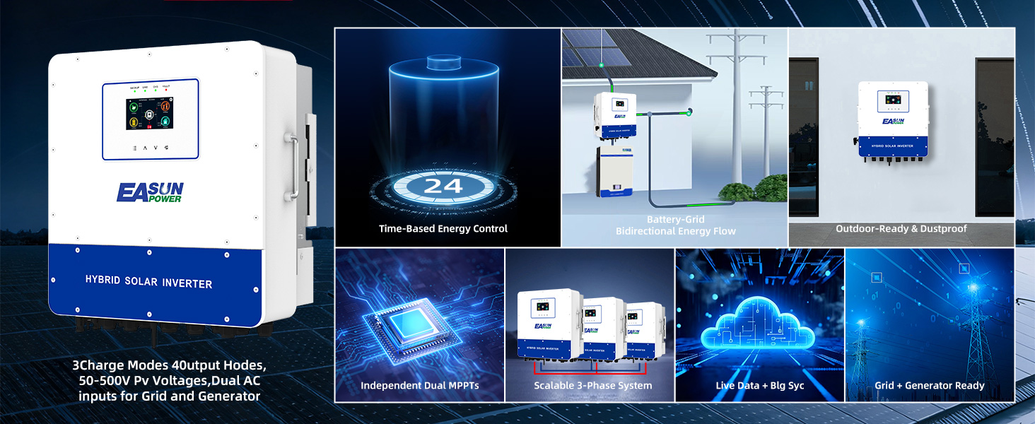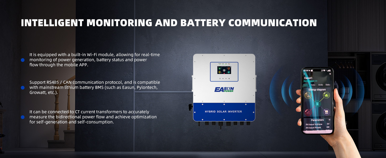Compatible with RS485 and CAN communication protocols, supporting major lithium battery BMS systems such as Easun, Pylontech, and Growatt.