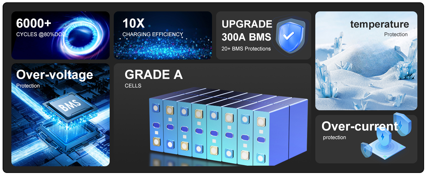 Built with A+ grade cells, 6000+ cycles @ 80% DOD,offering low risk of overheating or fire